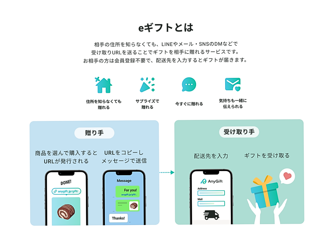 商品ページで「eギフトで贈る」を選択し、購入後に発行される受け取り用URLをLINEやメール、SNSのDMなどでお相手に送ることで贈れます。